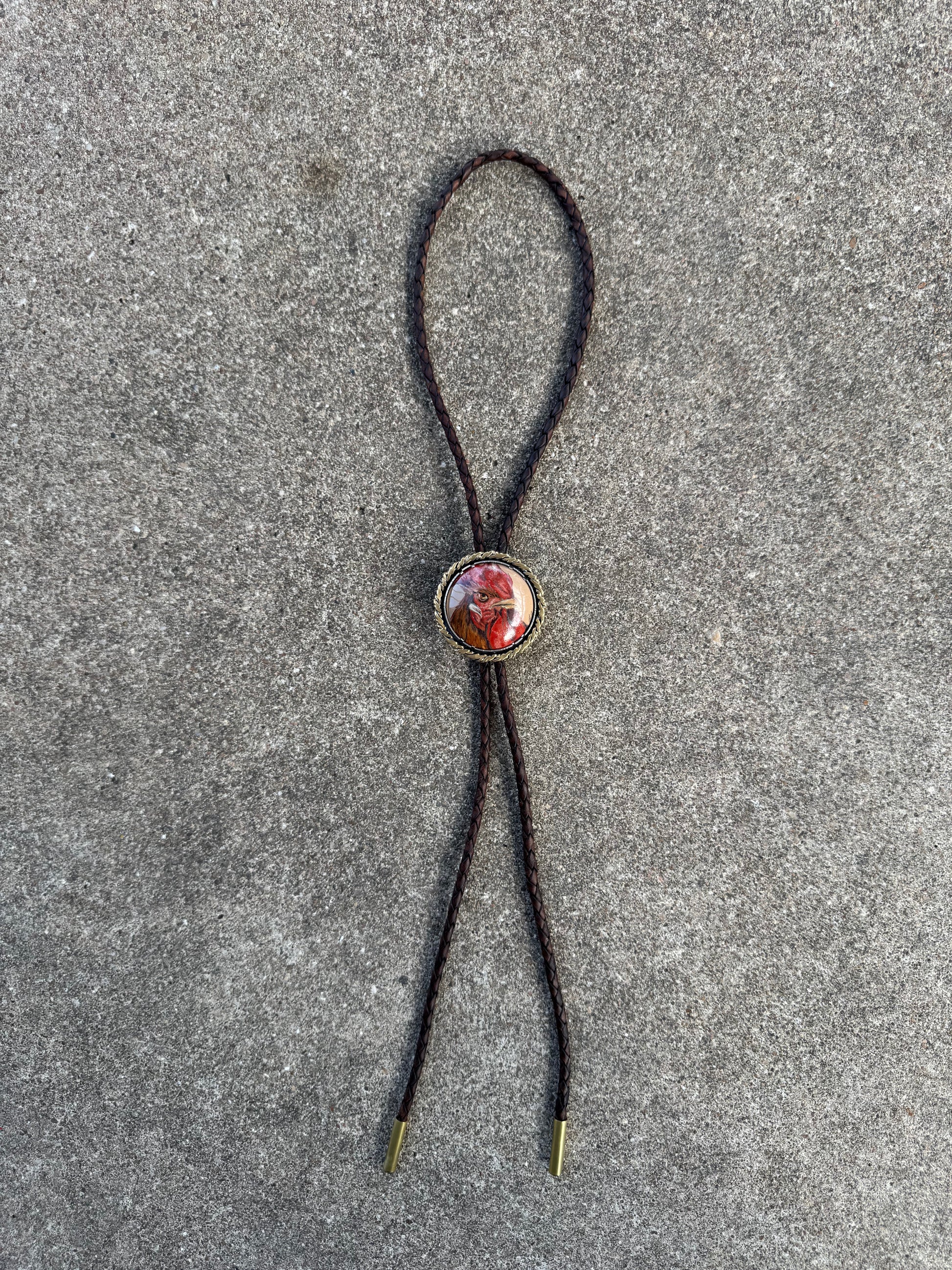 One of a kind vitreous enamel hand painted rooster. Set in brass with an oxidized sterling silver bezel. Bolo tie tips are made with brass and oxidized sterling silver.